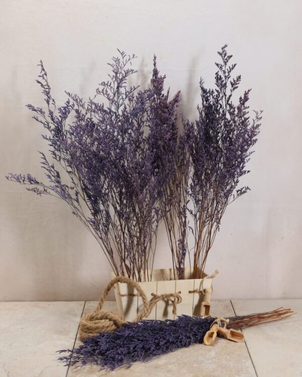 Il Limonium sinuatum, noto anche come lavanda di mare, è una pianta da fiore della famiglia delle Plumbaginaceae. Ha steli pelosi e ramificati accompagnati da numerosi piccoli grappoli di fiori, che di solito sono di varie tonalità di viola. Gli esili steli ramificati e i piccoli fiori delicati conferiscono al limonium un effetto ondeggiante e danzante, che lo rende un perfetto fiore di riempitivo nelle composizioni floreali sia fresche che secche, apportando leggerezza e freschezza. Il limonium preservato ha le stesse caratteristiche di quello fresco, ma con una maggiore scelta di colori, che lo rendono un elemento ornamentale popolare per diverse occasioni di decorazione floreale.